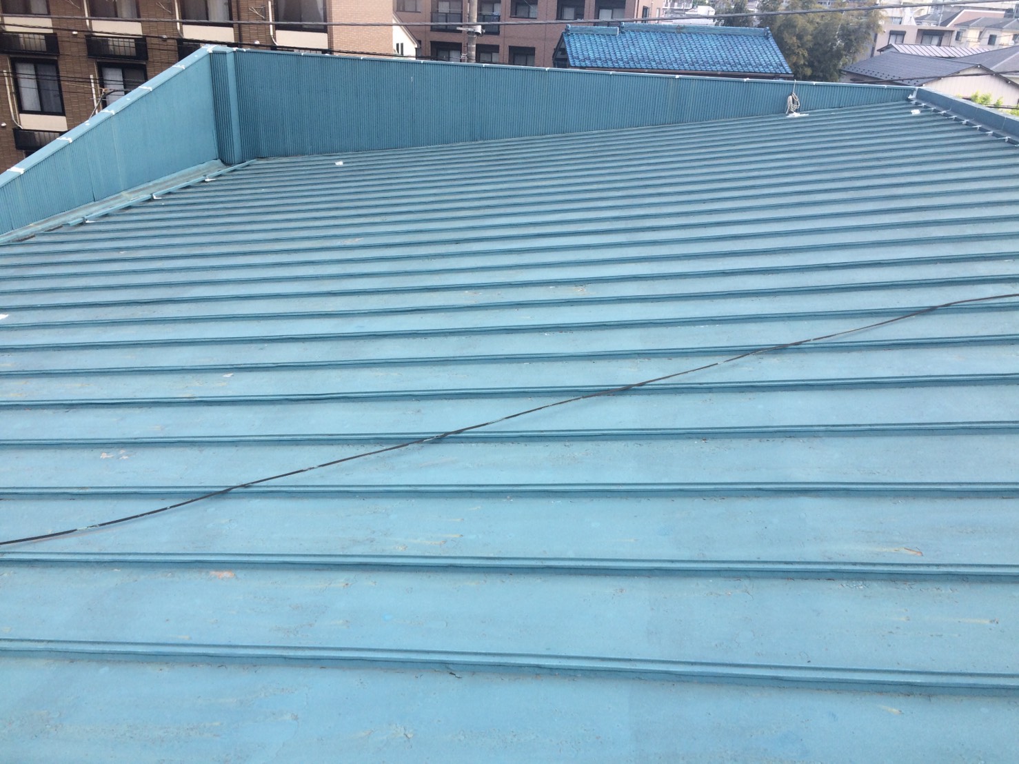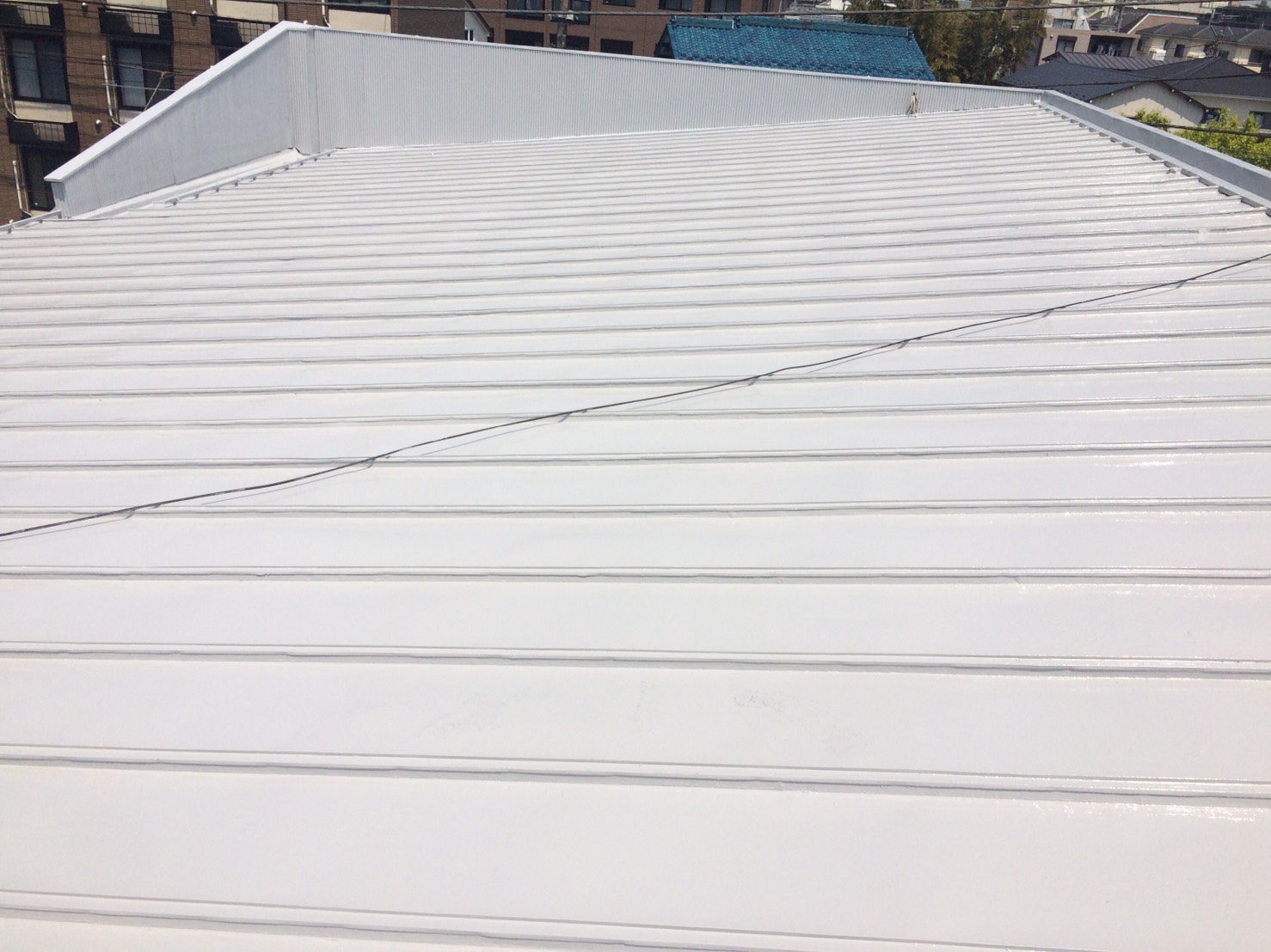 店舗の屋根塗装をしました。錆止めにエポキシ2液型、上塗りにシリコン塗料を2回塗りで仕上げました。